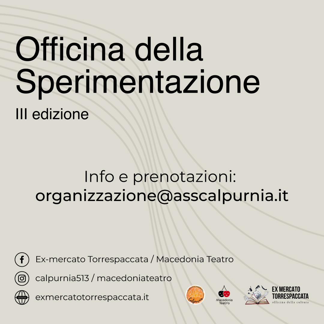 L’Officina della Sperimentazione, che giunge ora alla sua terza edizione, desidera essere non una vera e propria rassegna o stagione teatrale, quanto piuttosto un contenitore, una cornice, che possa ospitare al suo interno spettacoli e lavori performativi di differente natura, uno spazio libero e aperto alla sperimentazione – per l’appunto – così come l’Ex Mercato di Torrespaccata è nato e desidera continuare a crescere.